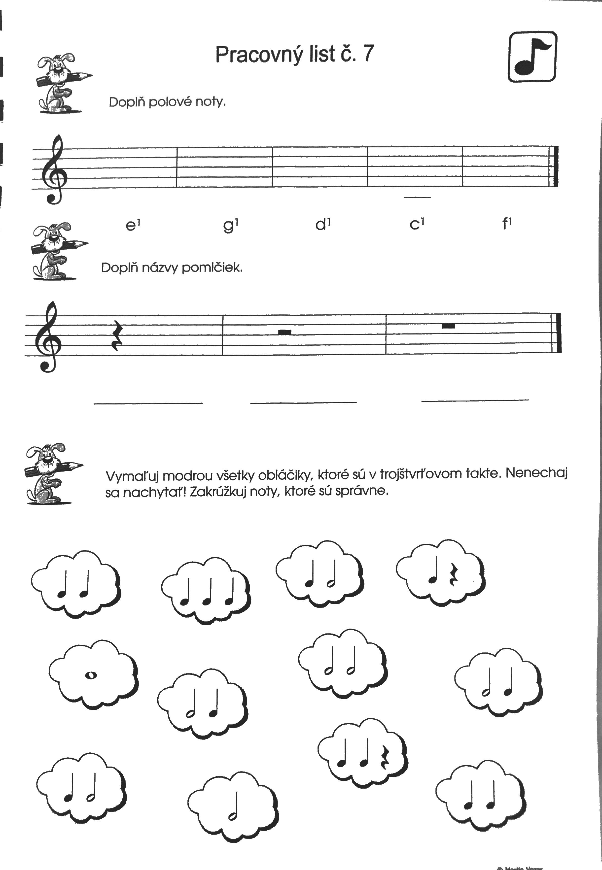 ...a je tu ďalší pracovný list, číslo 7. V prvom cvičení treba správne vpísať notu do notovej osnovy, v druhom cvičení napísať ako sa volajú pomlčky (stačí číslom na kolko sa počítajú) a v posledných obláčikoch budeme maľovať modrou farbičkou len tie obláčiky, ktoré sú v 3/4 takte. Že ako? Najprv musíme nad každú notu a pomlčku napísať číslo na koľko sa počíta (je ich tam až 24😮..) a potom spočítať tak, aby nám v obláčiku vyšlo číslo 3. Ďakujem rodičom za zaslanie ☺️