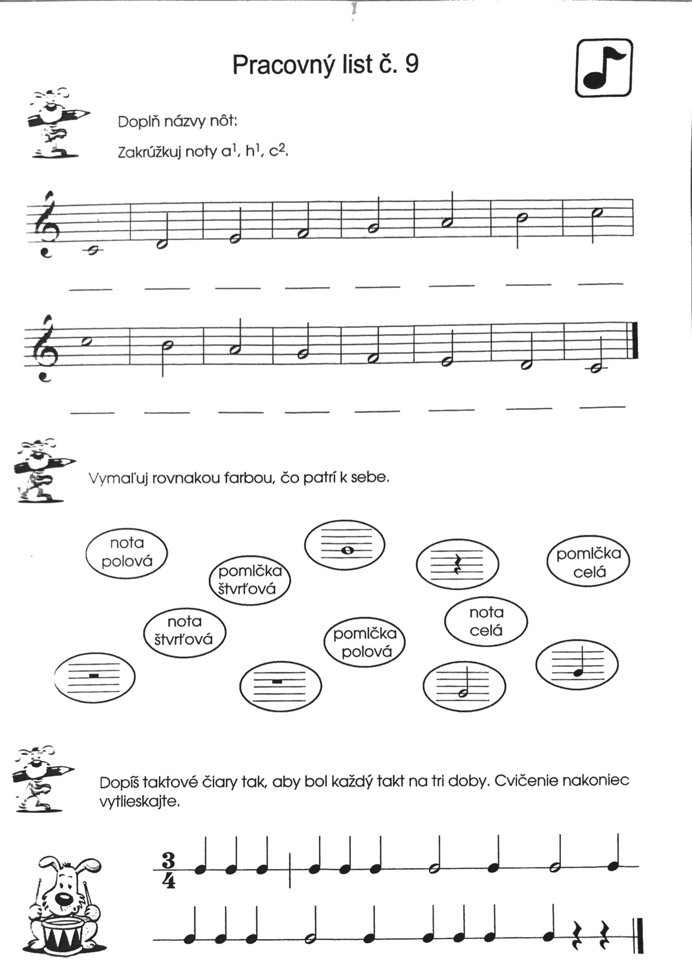 Sú v ňom noty od c1 po c2, ktoré by mal žiak na konci PHV vedieť identifikovať a napísať - neskôr aj zahrať 👍 Tiež všetky základné pomlčky, ktoré sa pri hraní budú vyskytovať a usporiadanie nôt v 3/4 takte, čo treba len správne porátať (nad každú notu napísať číslo na koľko sa nota počíta) a pri výsledku "3" dať taktovú čiaru..bonusom by mohlo byť vytlieskanie celého cvičenia pri počítaní RAZ-DVA-TRI alebo pr-vá, dru-há tre-tia 👏