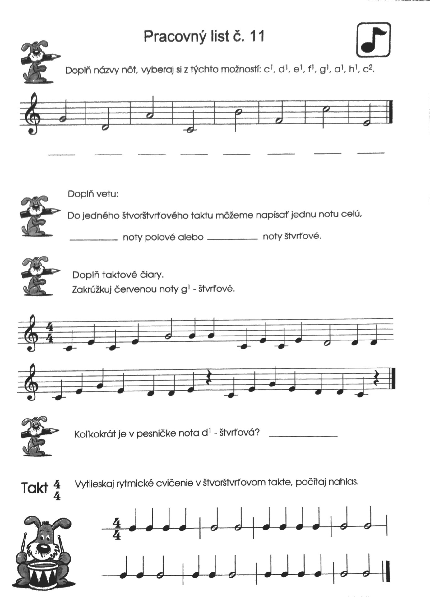 V tomto týždni budeme pokračovať v ďalšom pracovnom liste - č. 11, kde je potrebné správne podpísať noty od c1 po c2 a vedieť popočítať noty v 4/4 takte.